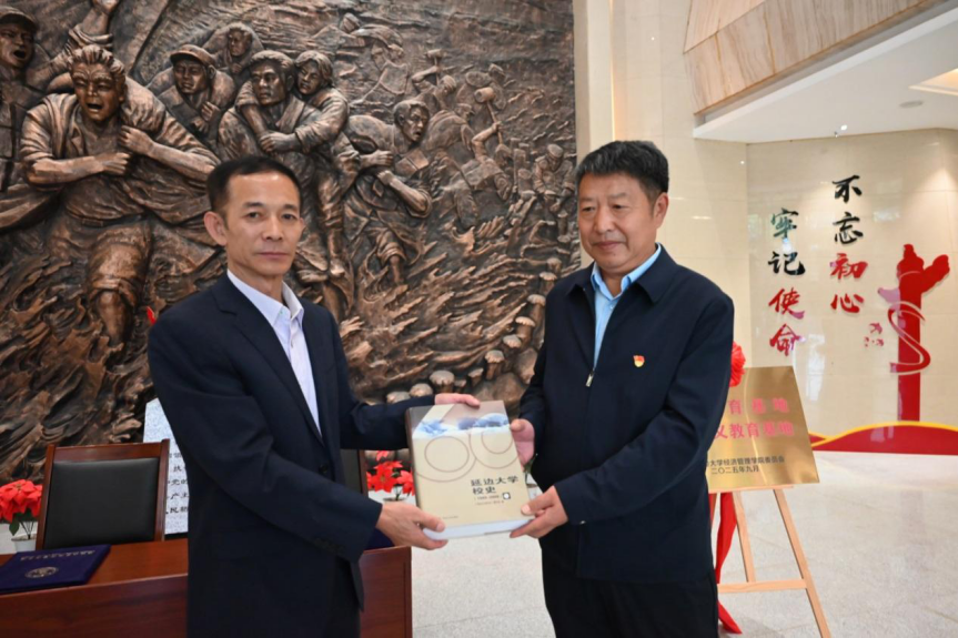 在珲春市大荒沟党史教育馆,冯阳与大荒沟党史教育馆馆长邹志鹏共同签署了合作协议,并为学院教育基地揭牌。王国臣代表学院,向大荒沟党史教育馆赠送《延边大学校史》。