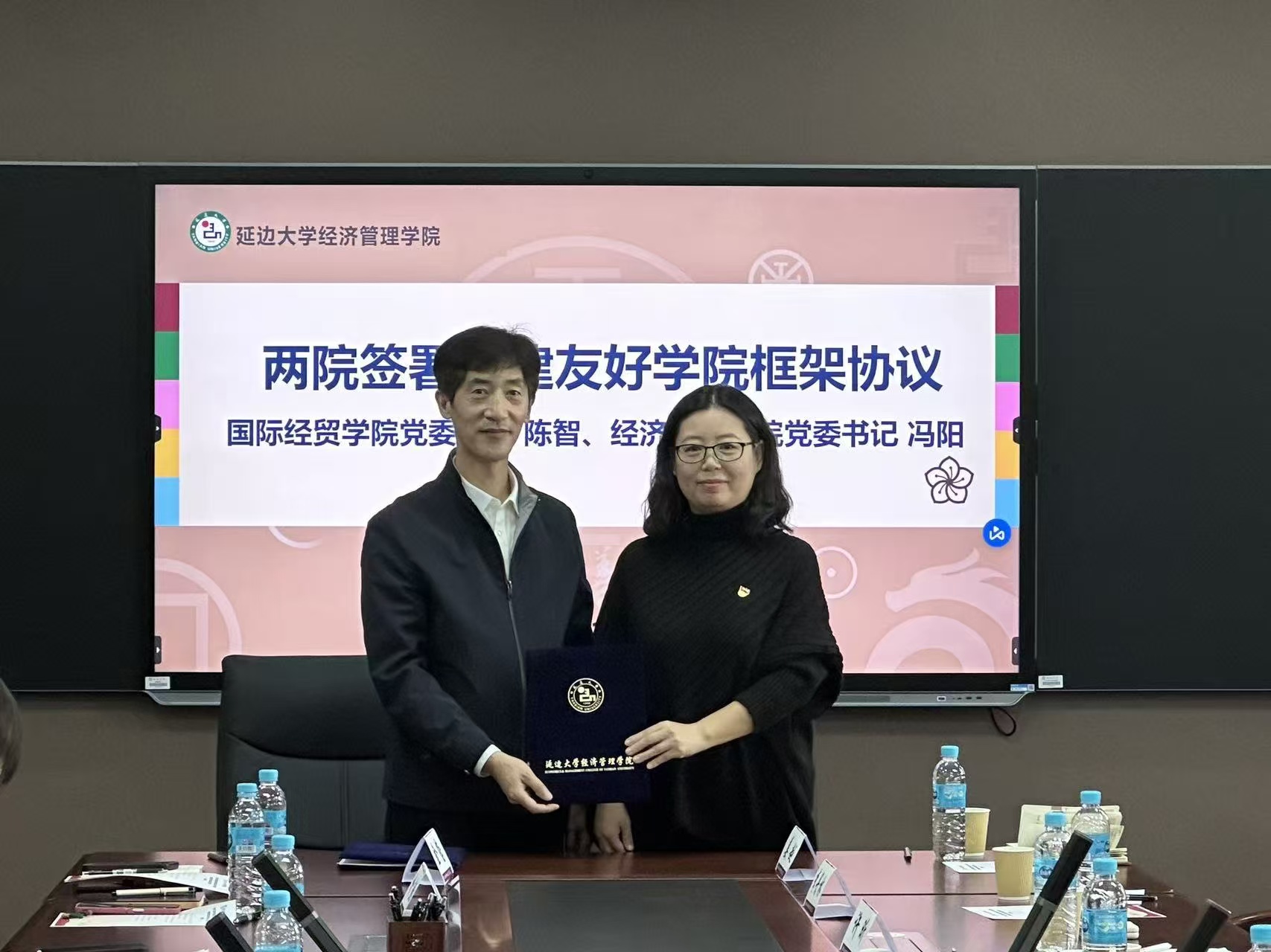 延边大学经济管理学院党委书记冯阳与吉林工商学院国际经贸学院党委书记陈智签署共建友好学院框架协议