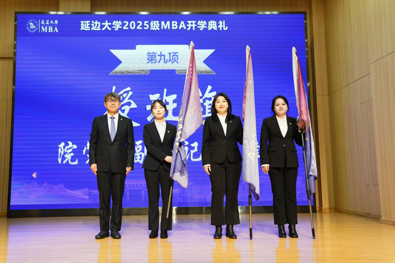 仪式最后,经济管理学院党委副书记李峰将象征着集体荣誉与责任使命的班旗授予新生班级。旗帜飘扬的不仅是集体的荣誉,更是所有新生对未来的承诺。这一刻,理想与使命交汇,个人与集体在仪式中融合,标志着一段崭新的奋斗征程正式启航。相信2025级MBA新生必将承载着这份荣耀与责任,在未来的学习生涯中砥砺前行,共同书写属于他们的精彩华章。